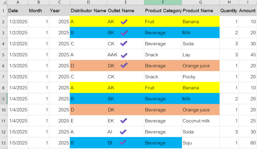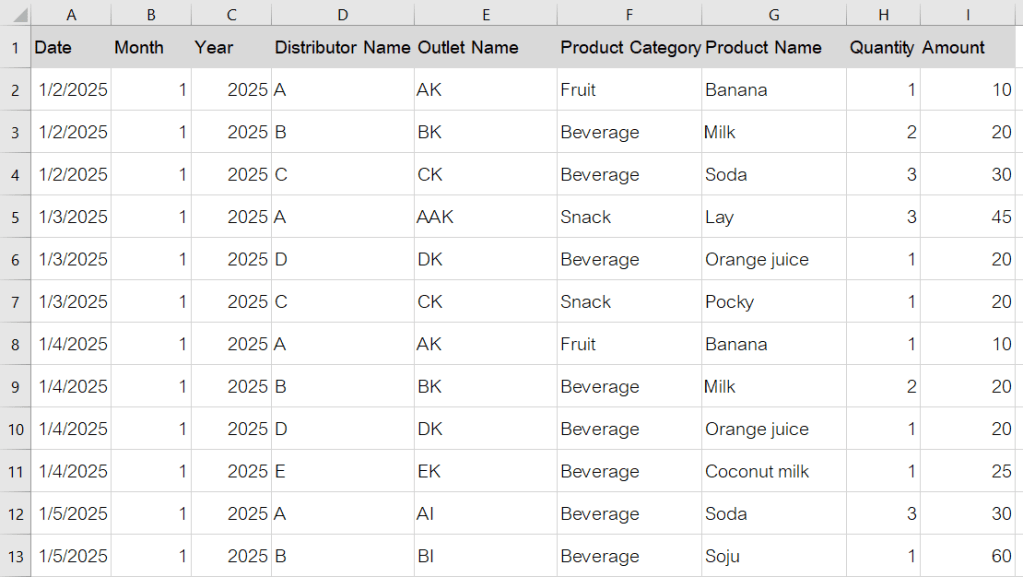 วันก่อนเราได้โจทย์มาจากหัวหน้าทีมเซลล์ เค้ามีข้อมูลยอดขายมาให้ว่า แต่ละศูนย์กระจายสินค้า(distributor) นั้นขายของให้ร้านขายของชำ(outlet) ร้านไหนไปบ้าง ขายสินค้าอะไร และประเภทไหนไปได้บ้าง สิ่งที่ทางหัวหน้าทีมเซลล์อยากรู้ คือ