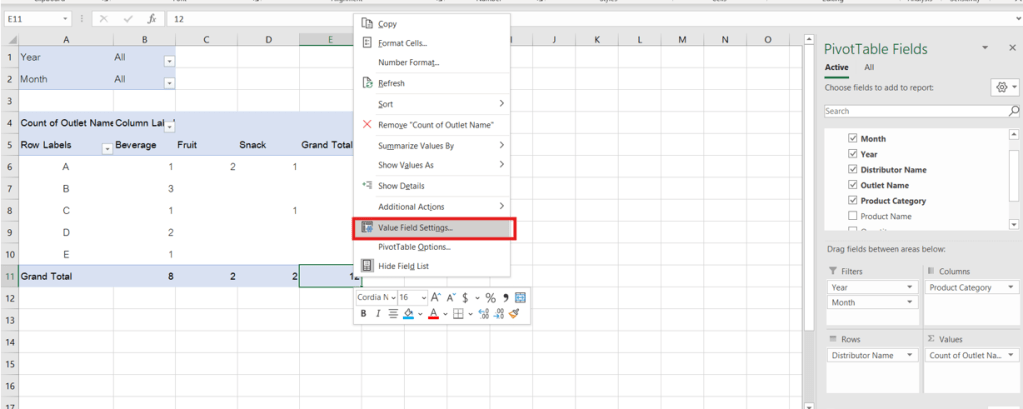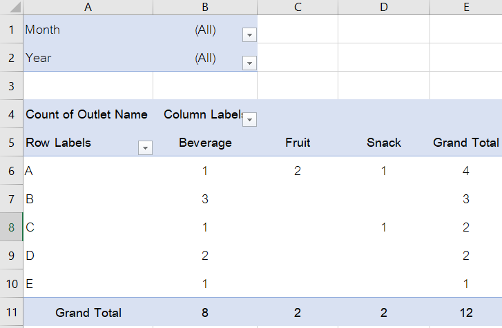 เห็นได้ว่า จากที่ร้านขายของชำ(outlet) ควรจะมีเพียงแค่ 8 ร้าน แต่ตาราง pivot table สรุปข้อมูลมาได้ทั้งหมด 12 ร้าน ดังนั้น วิธีแก้ทำได้แค่เพียงคลิกเดียว คือ ให้กด