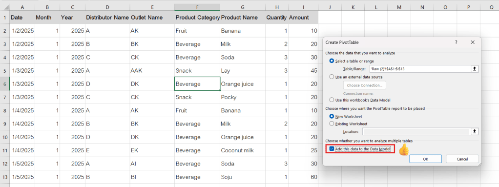 ✅check : Add this data to the Data Model ด้วยตอนทำ pivot table ดังรูปที่ 4