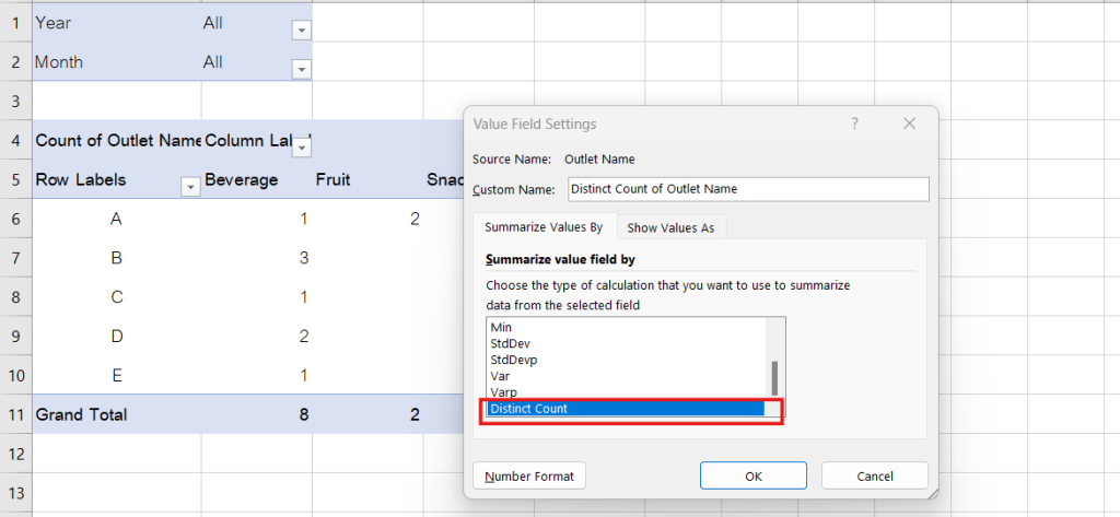 ในกล่อง Summarize value field by เลือก Distinct Count (รูปที่ 6)
