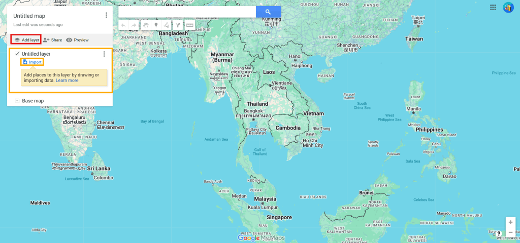 ใครที่ยังไม่มี Unititled layer ให้กด Add layer ก่อน ใครมีแล้วสามารถกด Import ได้เลย (กด import เพื่อนำเข้าไฟล์เส้นทางรถเมล์ที่เราได้ดาวน์โหลดไว้ก่อนหน้านี้) > เลือกตำแหน่งที่เก็บไฟล์ที่ดาวน์โหลดไว้ก่อนหน้านี้ > OK เพื่อนำเข้าไฟล์