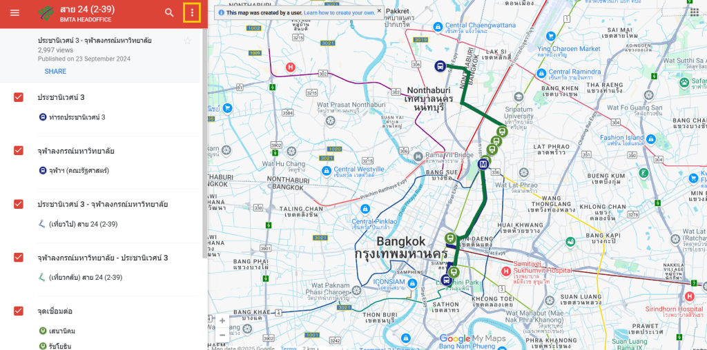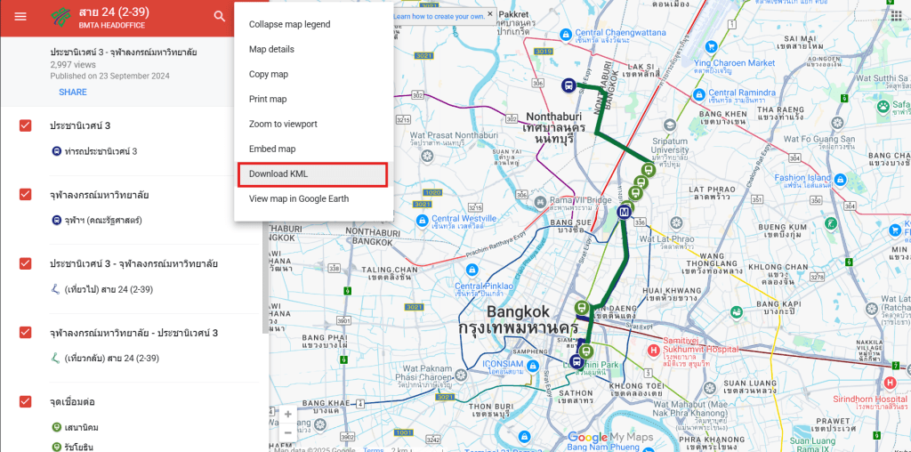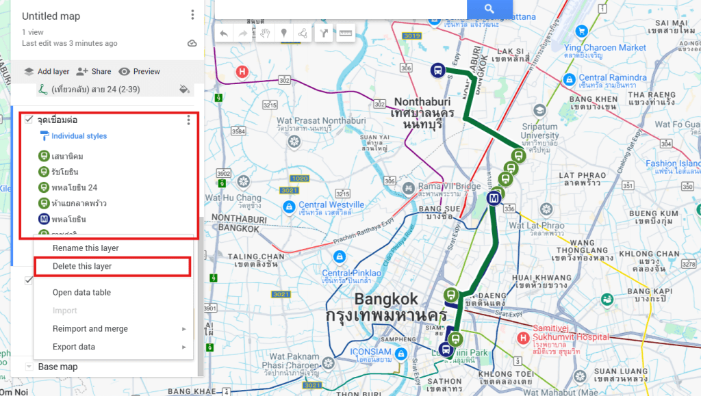 อืมม … จะใช้ line map ใน Looker Studio ก็ดูจะนานไป หรือจะให้พี่กราฟฟิคมานั่งลากเส้นให้ทีละเส้นทางก็ดูจะลำบากไป เราเลยไปลองหาวิธีการดู และท้ายที่สุด My Google Maps นี่แหละ ที่ตอบโจทย์สำหรับปัญหานี้