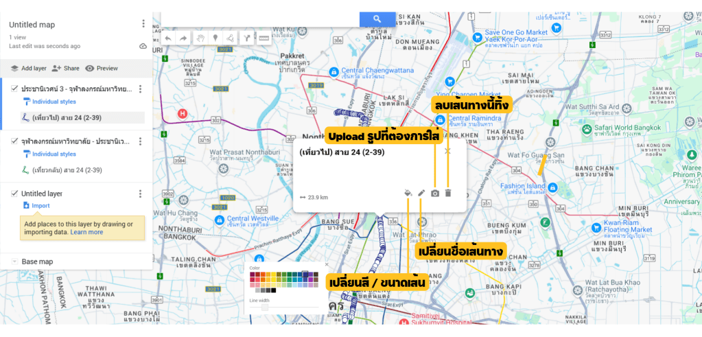 กรณีที่เราอยากเปลี่ยนสีเส้น เพิ่มขนาด เปลี่ยนชื่อเส้นทาง Upload รูปสถานที่ หรือลบเส้นทาง สามารถกดที่เส้นทางนั้นๆ จะขึ้น pop up มาดังรูปด้านล่าง และสามารถเปลี่ยน หรือลบสิ่งต่างๆได้ดังรูป