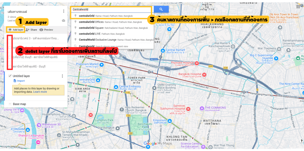 • delist layer ที่เราไม่ต้องการเพิ่มสถานที่นั้นลงไป (เหลือไว้แค่ layer ที่เราเพิ่มใหม่มาก็พอ)