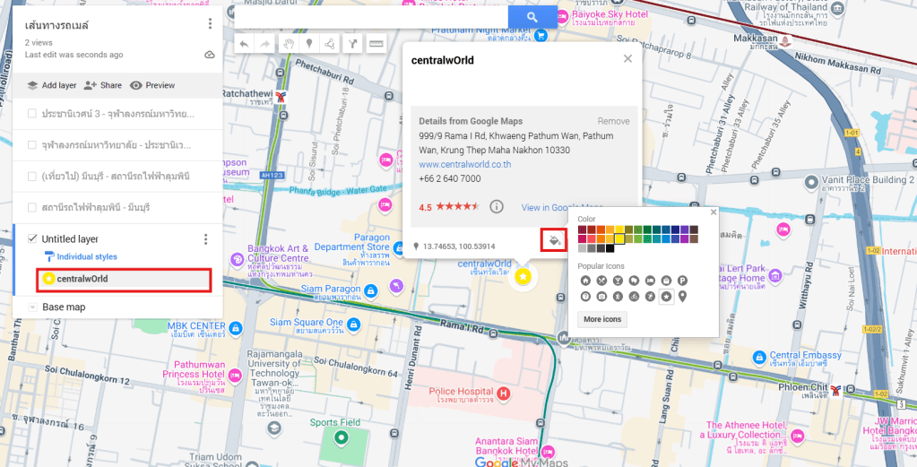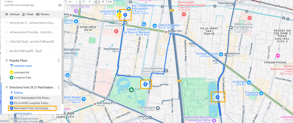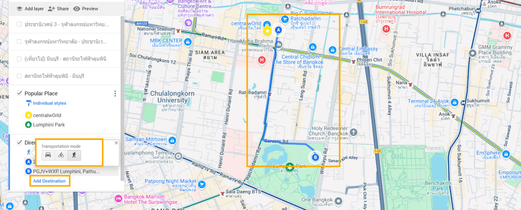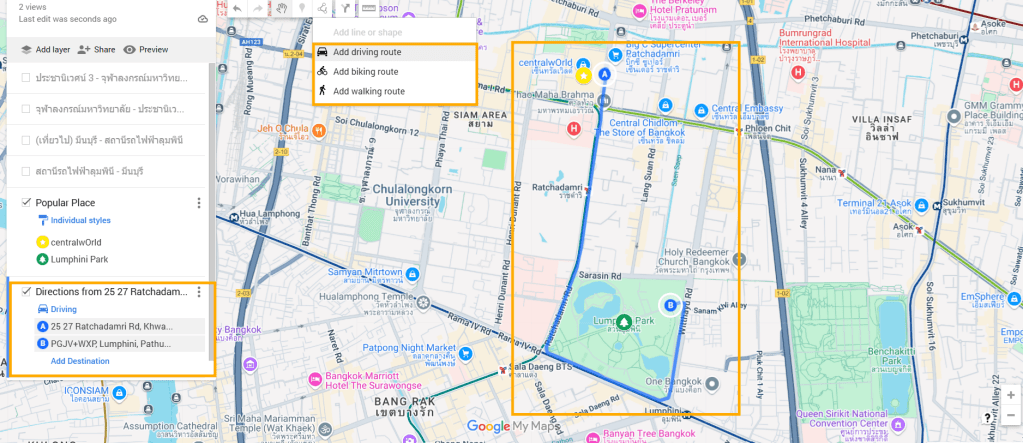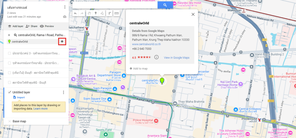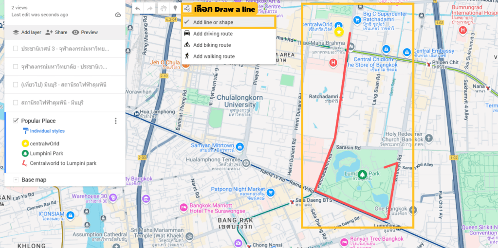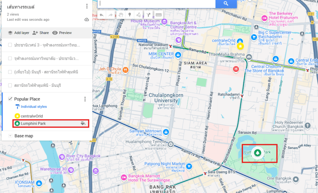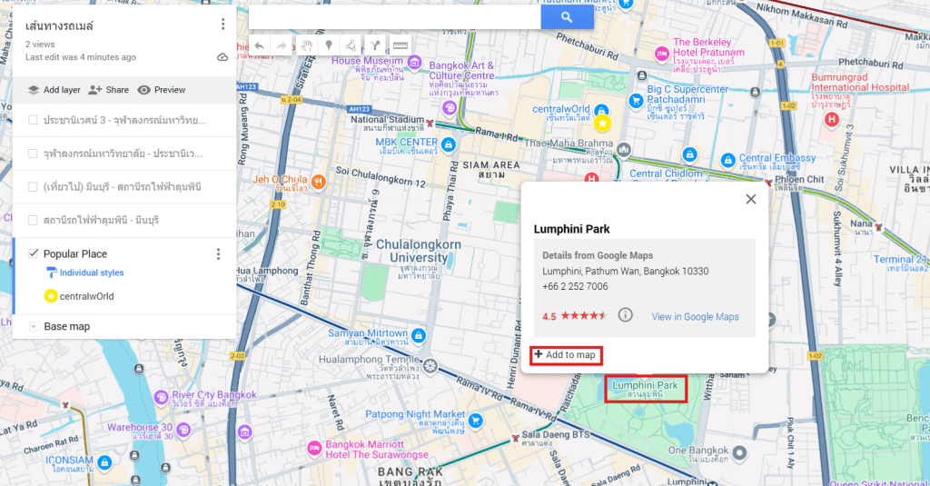 สมมติเราอยากไปสวนลุมพินี ก็เอาเมาส์ไปกดที่สวนลุมพินี > Add to map แค่นี้ก็เรียบร้อย หมุดของสวนลุมพินีก็จะโดนปักไปยัง layer ที่เราเลือก