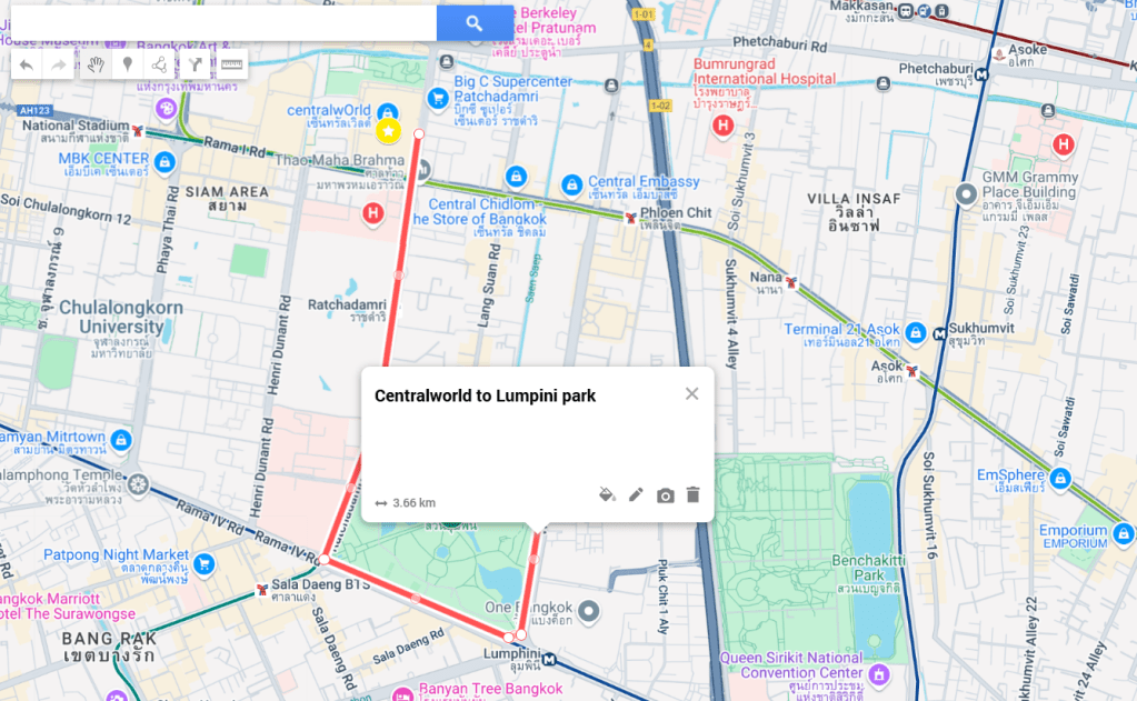 วิธีนี้เป็นการสร้างเส้นทางที่ง่ายมาก เพียงแค่ กดจุด A คือ Centralworld จากนั้นลากเมาส์ไปที่สวนลุมซึ่งคือจุด B ได้เลย มันจะทำการ suggestion เส้นทางมาให้เราโดยอัตโนมัติ ไม่ต้องนั่งกังวลว่าทางนี้จะไปได้หรือไม่ได้