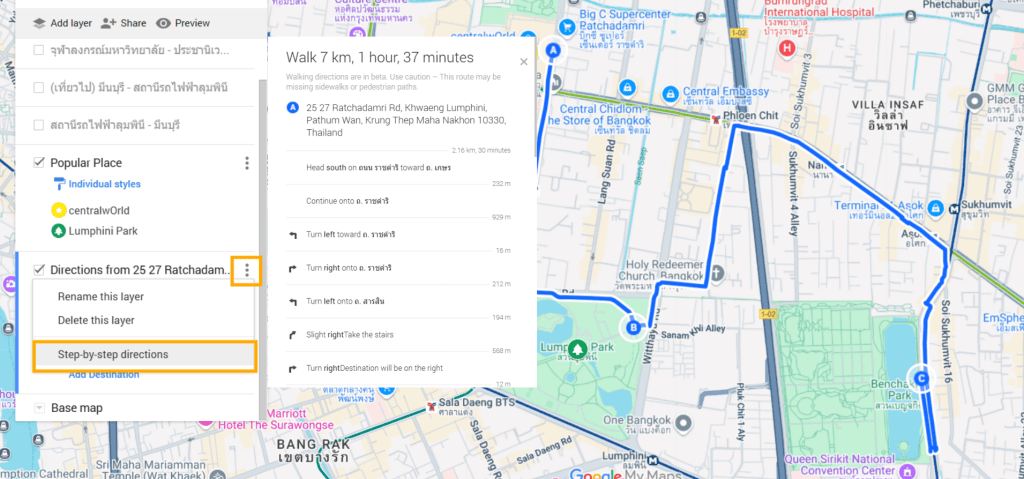กรณีที่อยากดูระยะทาง และวิธีการเดินทางแบบละเอียด ให้กดจุดสามจุดที่ layer นั้น > Step-by-step directions ก็จะขึ้น ระยะทาง เวลา และวิธีการเดินทางแบบละเอียด