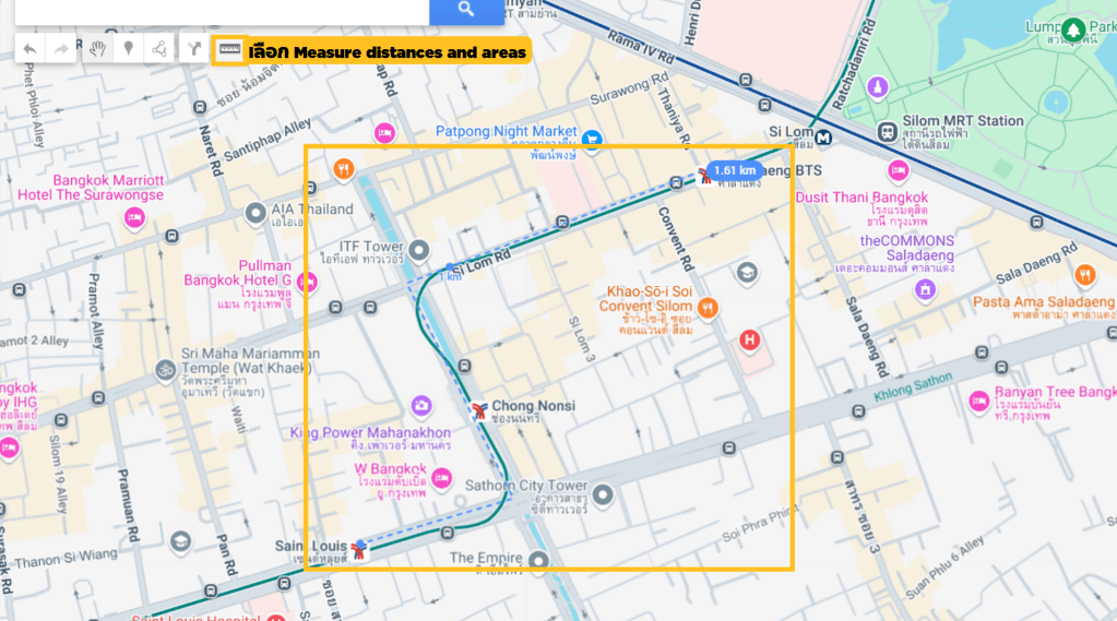 เลือก Measure distances and areas > ลากเส้นทางจุดต่อจุดตามที่เราต้องการวัด เป็นอันเสร็จสิ้น เราสามารถวัดระยะทางตามเส้นทางที่เราต้องการได้แล้ว ง่ายและสะดวกสุดๆ