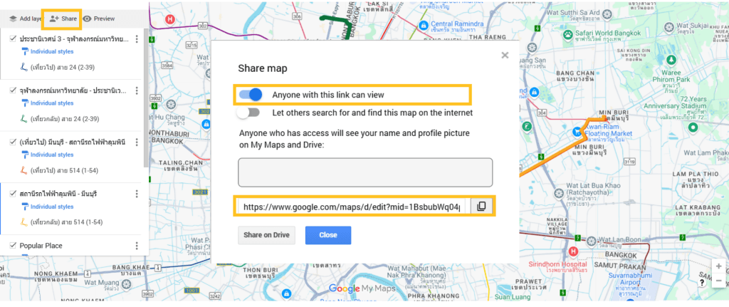 หลังจากที่เราทำแผนที่แล้ว เราสามารถกดแชร์เส้นทางที่เราทำไว้ให้เพื่อนๆของเราดูได้