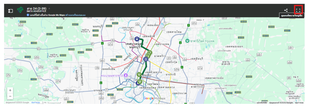 เราก็จะได้เห็นเส้นทางรถเมล์ที่เราเลือกมา แผนที่นี้สามารถ zoom in และ zoom out ได้