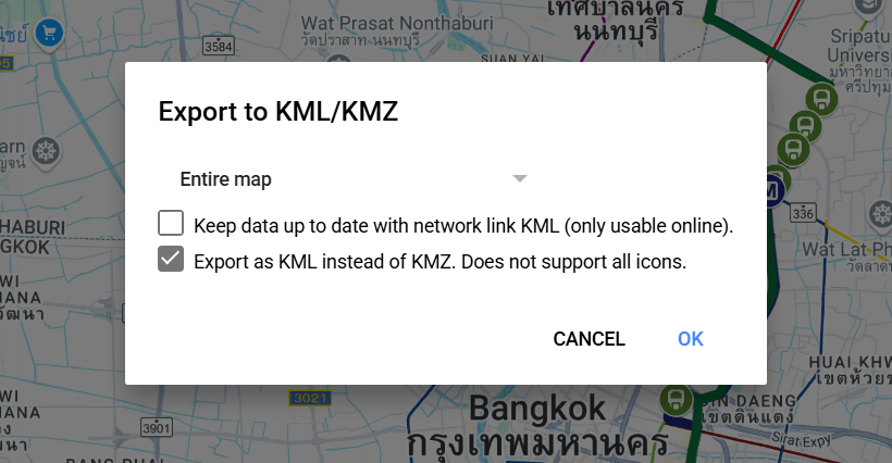 จากนั้นให้เรากด จุดสามจุด > Download KML > Export as KML instead of KMZ. Does not support all icon. > OK เพื่อดาวน์โหลดไฟล์นี้เก็บไว้ในเครื่องของเรา (ไฟล์ที่ได้จะเป็น .KML)